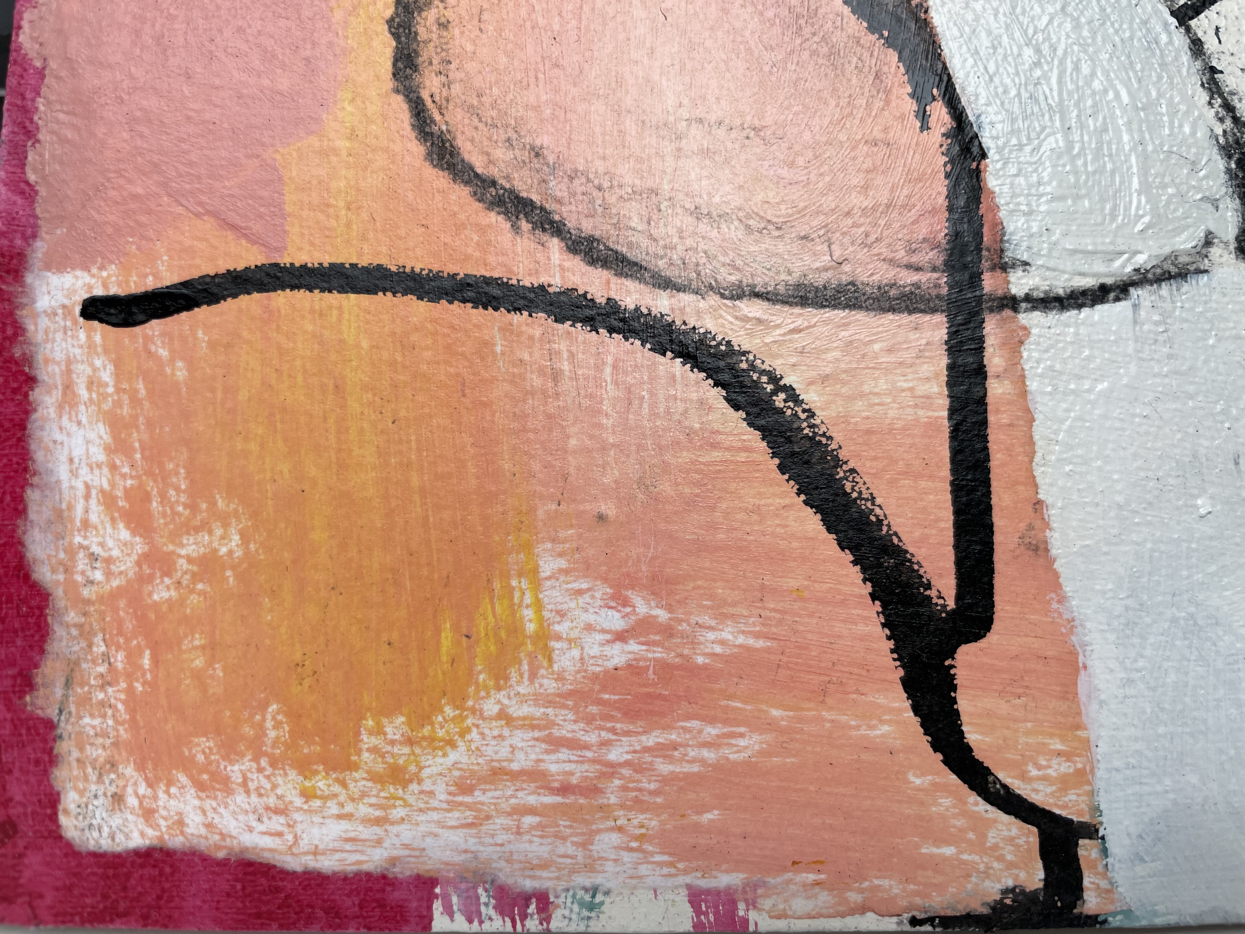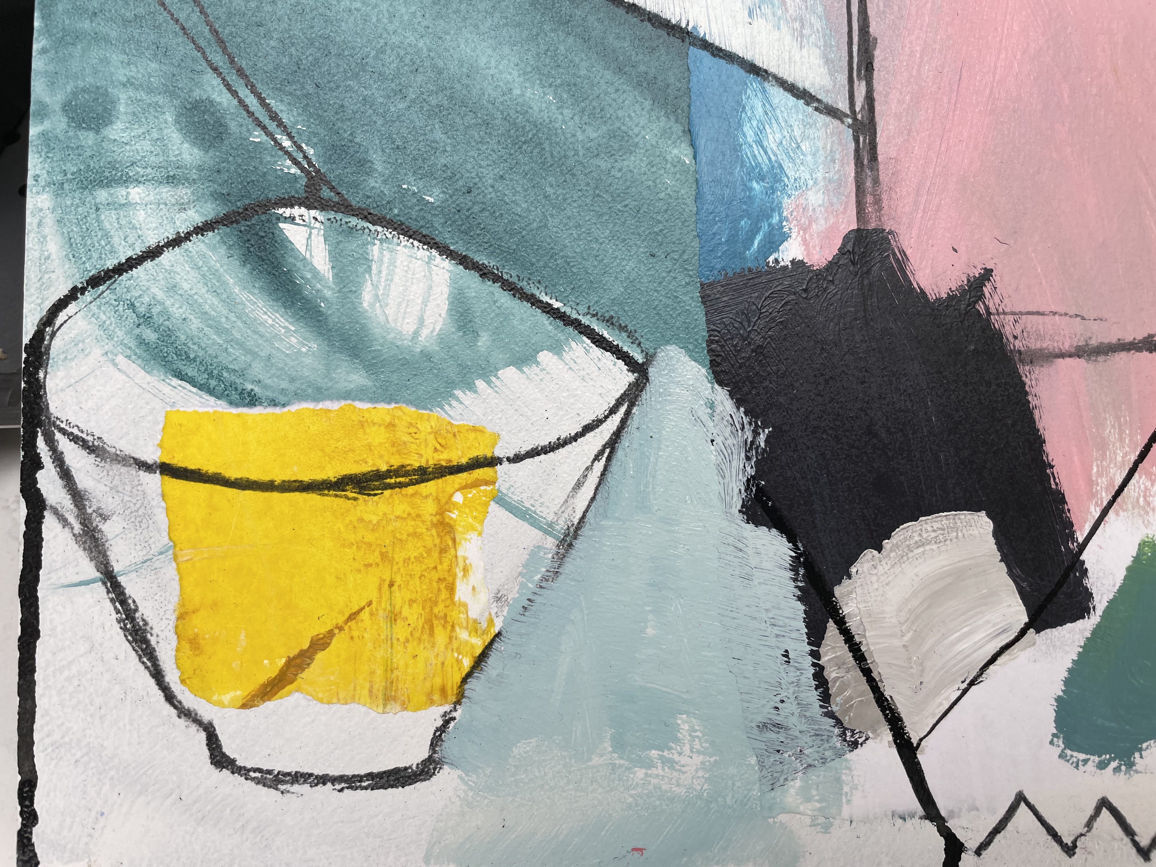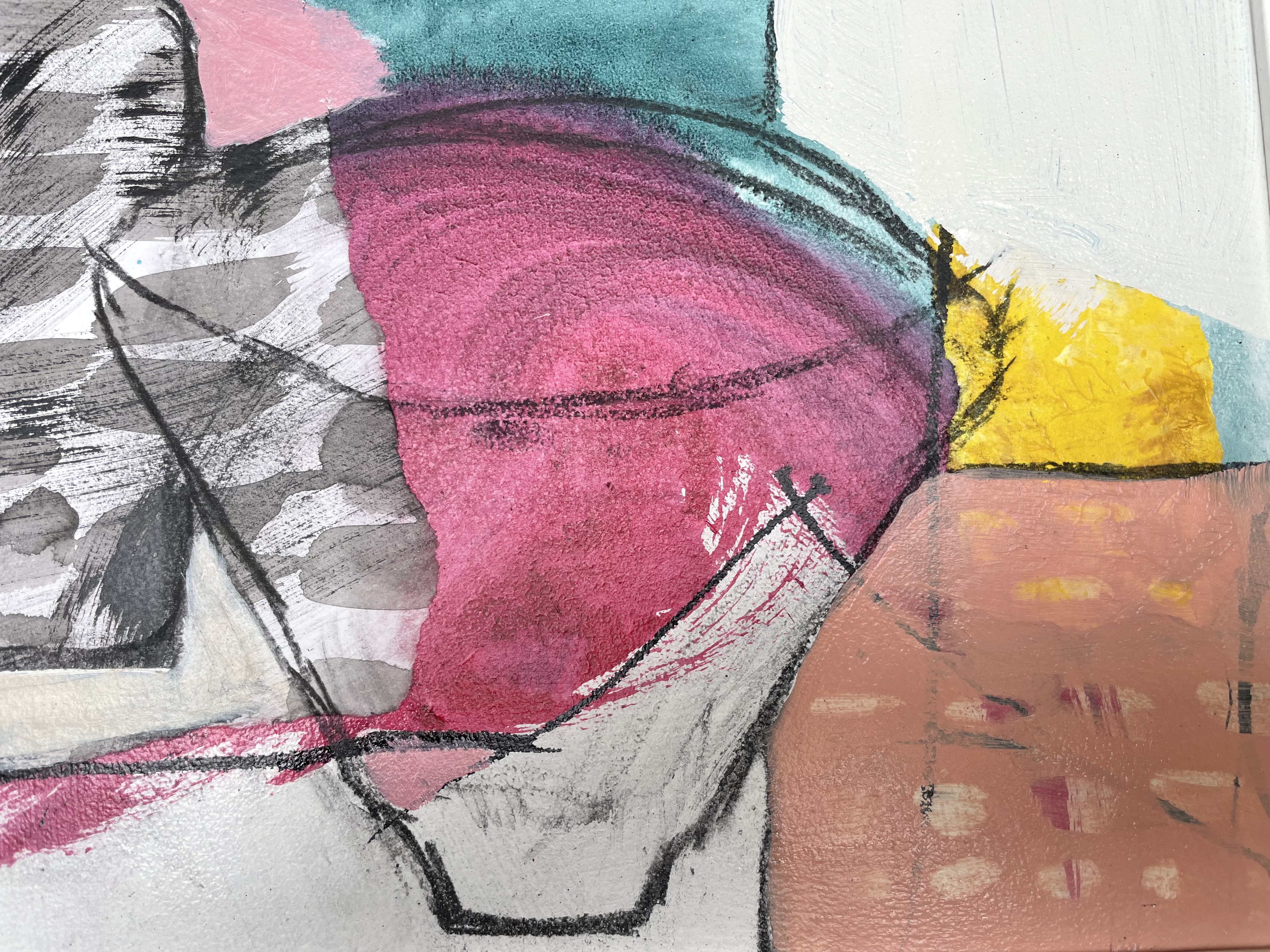 “In Louisa’s abstract paintings, she uses a meticulous repetition of patterns creating a mesmerising visual rhythm. By maintaining a consistent palette throughout the series, her artwork retains a cohesive identity. The decision to limit the palette was influenced by her collage techniques, resulting in a harmonious composition that captivates us, the viewer.”